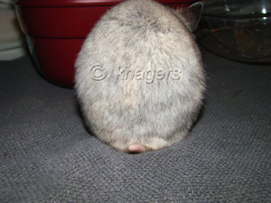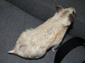 Sedert april/mei zag ik al een plekje in Misty's vacht (op haar kontje) waar alleen nog maar ondervacht was. Omdat het stabiel bleef, dacht ik dat het een irritatie van bodembedekking of zoiets was. Ik was overgeschakeld op de grove houtvezel omdat de fijne zo stoffig is. Maar misschien hangt haar blaasprobleem wel samen met dit? (Met Donkey in mijn achterhoofd ben ik extra oplettend). Feit is dat de laatste week ook haar rechter geurklier kaal werd en het plekje op haar kontje werd ook kaal. En de laatste dagen kwam daar ook nog een plekje bij op haar linkerbil waar de beharing dunner werd, evenals haar linker geurklier. Niet langer getalmd dus en maar weer naar de dierenarts.